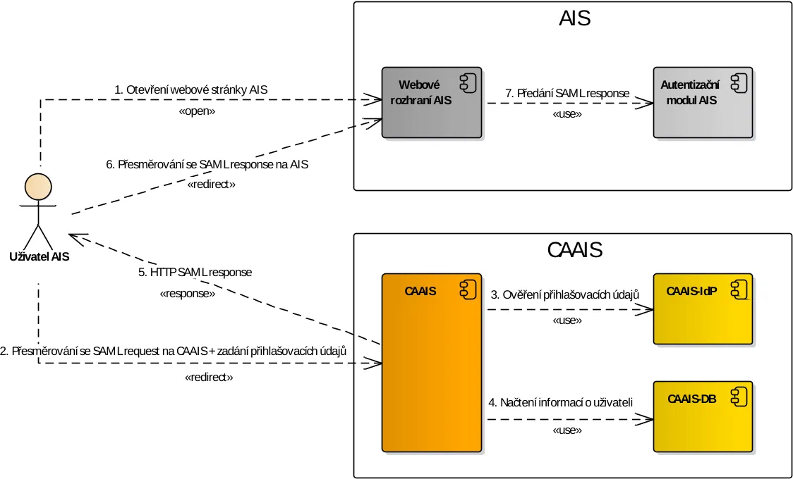 Proces autentizace uživatele, otevírajícího si stránku AIS pomocí protokolu SAML 2.0 skrze CAAIS, je popsán v následující části.