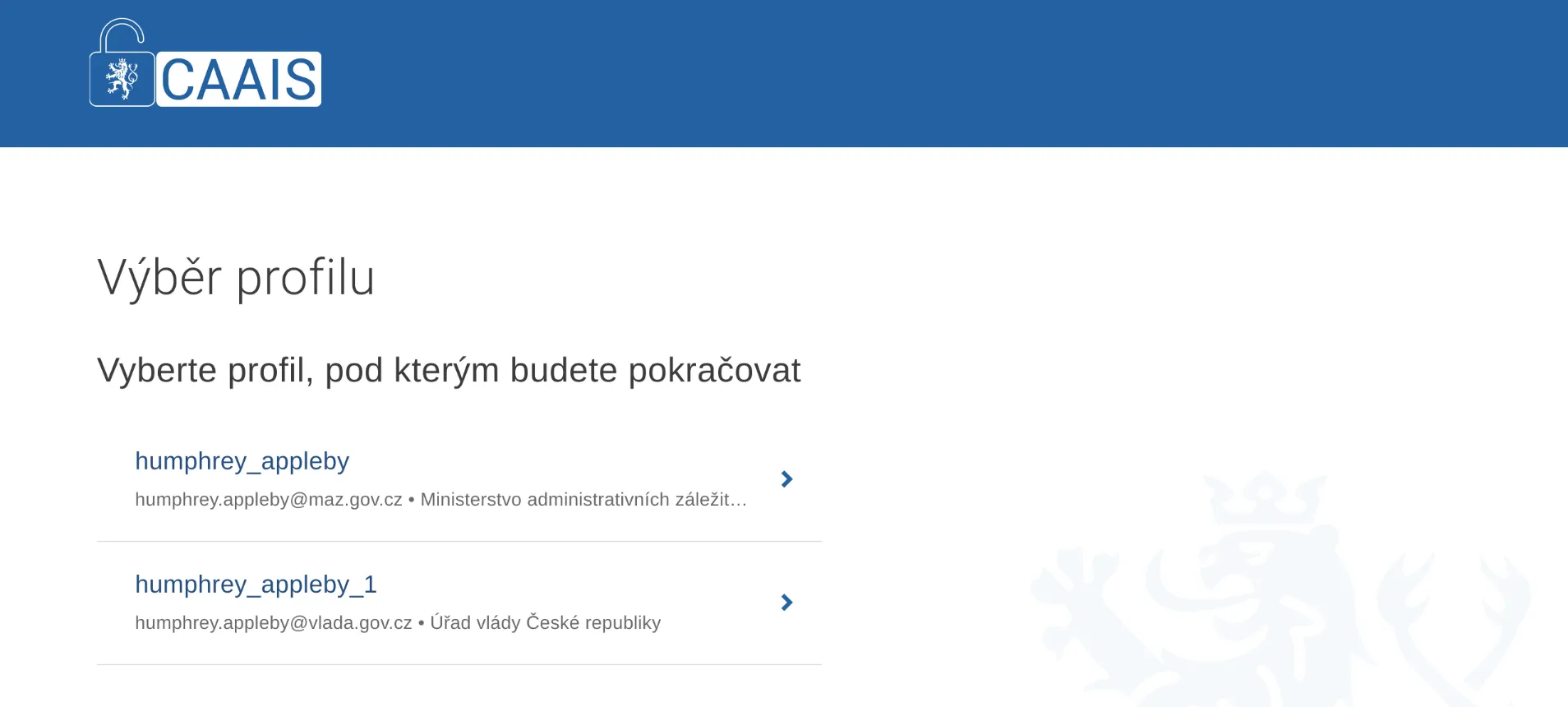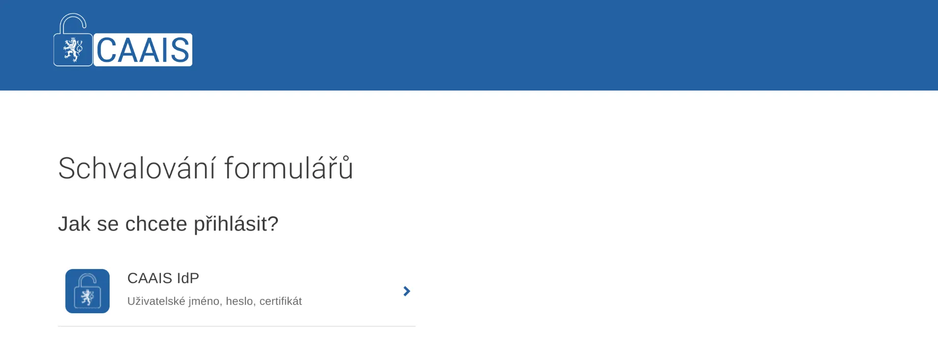 Nyní můžeme úspěšné založení AIS v CAAIS otestovat. Na adrese https://externalauthapi.caais-test-ext.gov.cz/login?atsId=MAZ_FORMS, kde místo MAZ_FORMS uvedete kód vlastního AIS, by se měla zobrazit přihlašovací stránka včetně CAAIS-IdP jako zdroje pro ověření uživatele.