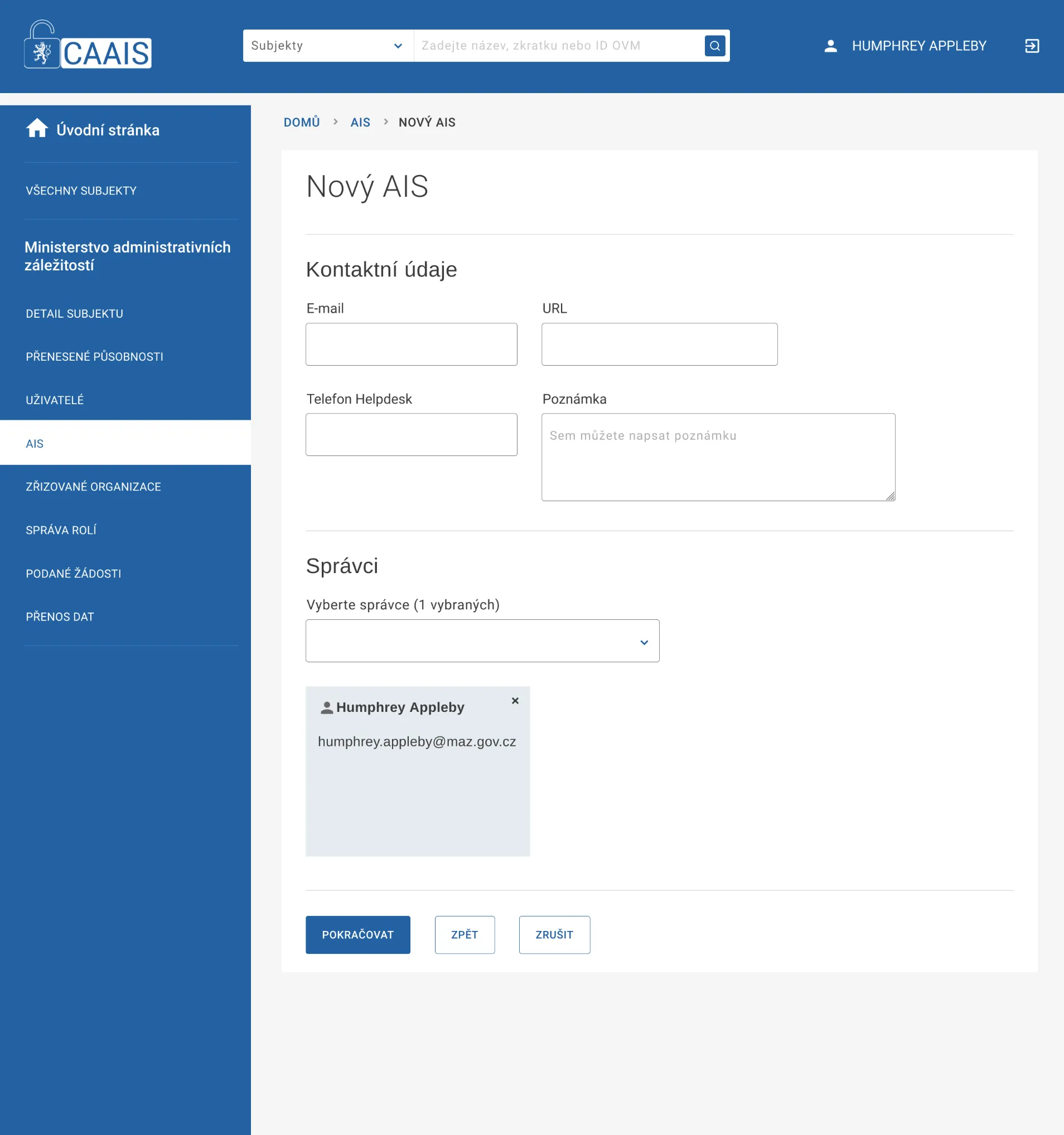 V dalším kroku přiřadíme AIS správce. Může jím být jakýkoli uživatel provozovatele. Pro jednoduchost volíme sami sebe. Po založení má správce pravomoc dokončit nastavení AIS.