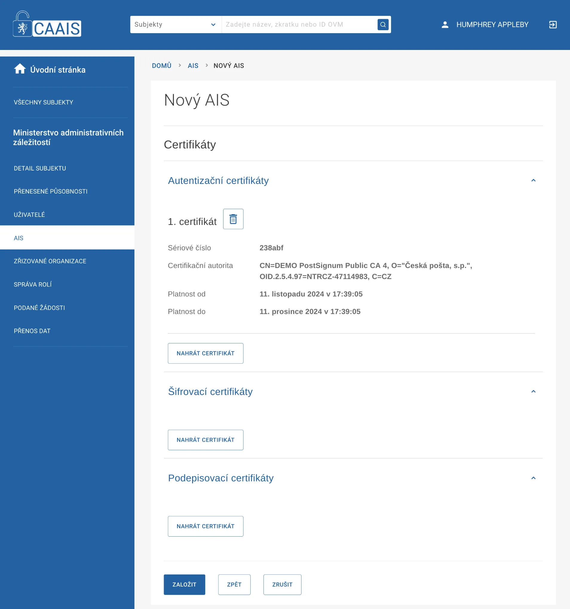 V dalším kroku do systému nahrajeme veřejnou část certifikátu pro autentizaci, jak jsme ji obdrželi od (testovací) certifikační autority. AIS může od CAAIS vyžadovat ověření přihlášení a údaje o uživateli jen tehdy, naváže-li TLS spojení s některým svým registrovaným certifikátem, jinak je spojení odmítnuto.