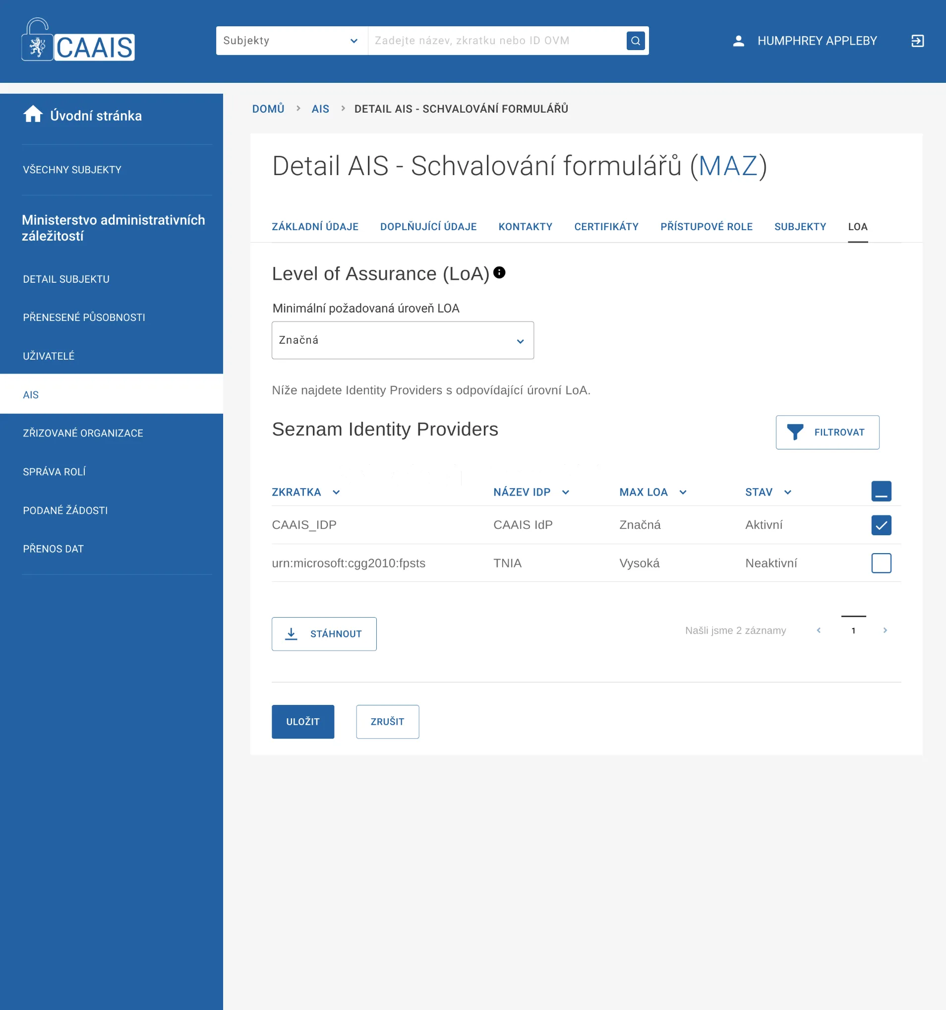 Po založení AIS musíme ještě bezpodmínečně vybrat alespoň jednu službu, proti které budeme uživatele ověřovat. Na záložce LoA vybereme CAAIS_IDP, neb ta jediná je na testovacím prostředí aktivní a změnu nastavení uložíme.
