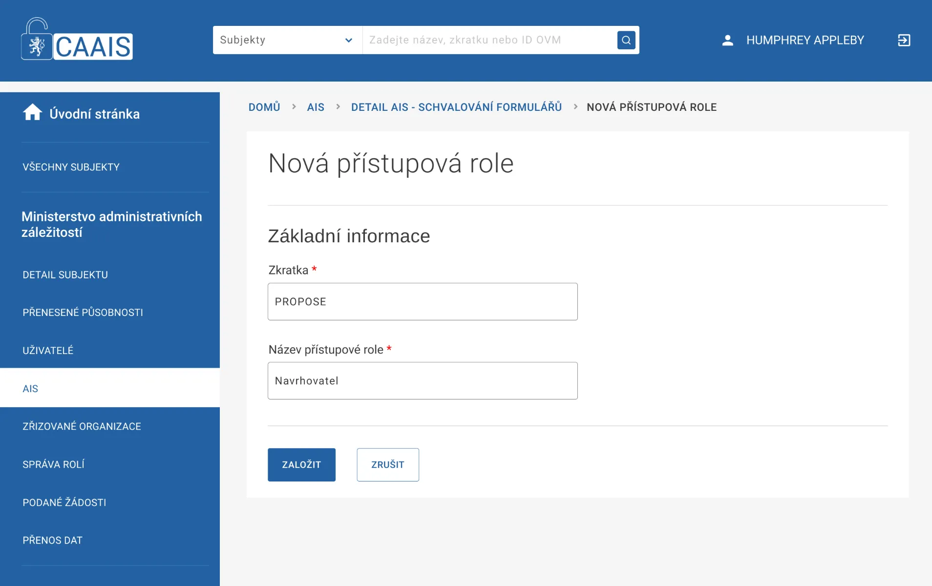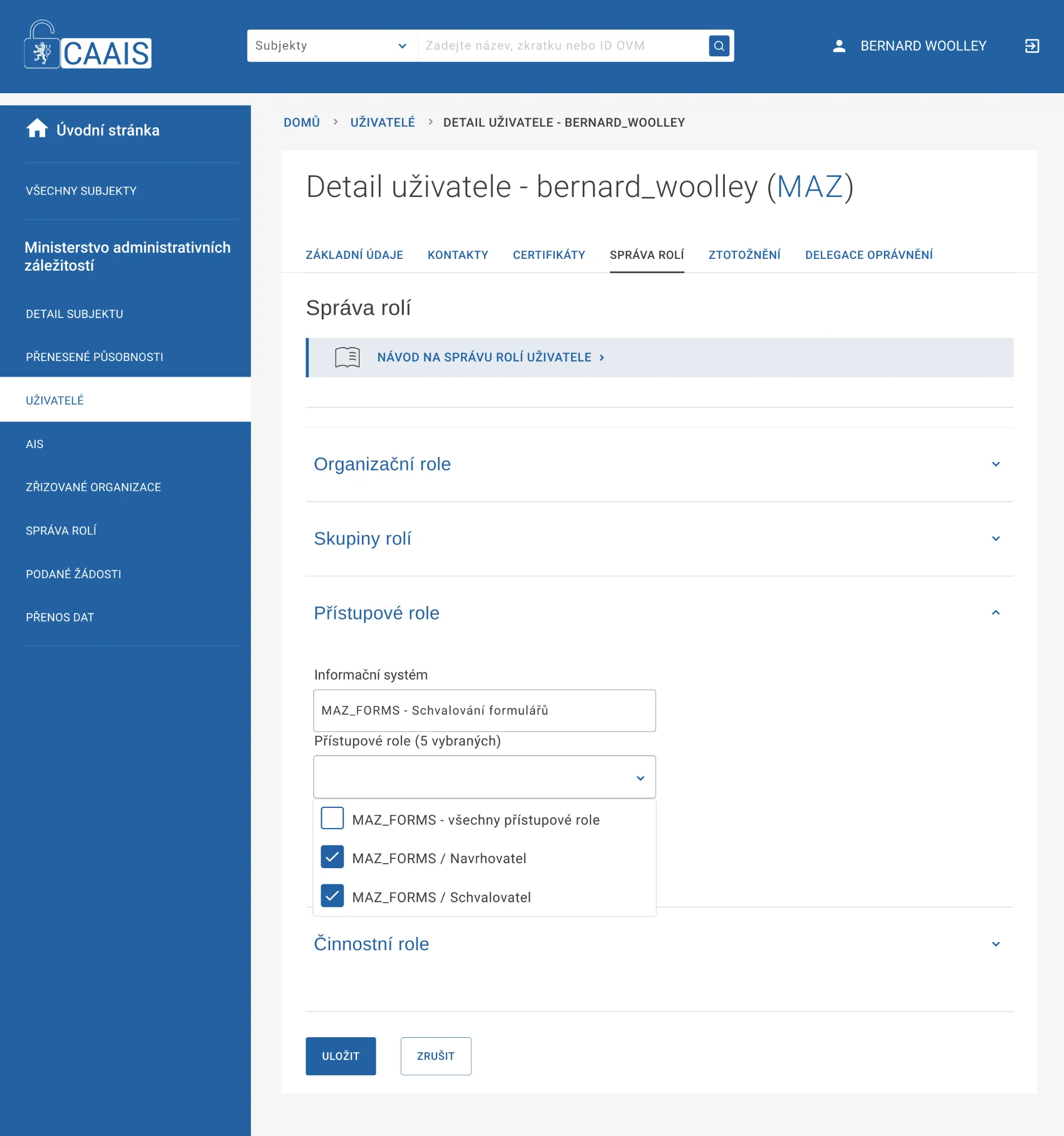 Pro dokončení nastavení prostředí testovacího scénáře ještě musíme roli přidělit konkrétním uživatelům. Přihlásíme se do CAAIS jako lokální administrátor subjektu, kterému jsme svěřili v předchozím kroku pravomoc ty které role přiřazovat. Lokálním administrátorem na Ministerstvu pro administrativní záležitosti, který se stará o správu uživatelů, je Bernard Woolley. Po přihlášení vybere z menu uživatelů spadajícím pod jeho subjekt – Ministerstvo pro administrativní záležitosti – konkrétního uživatele, kterému chce role svěřit. Pro jednoduchost vybírá sám sebe a na záložce správa rolí si přiřazuje přístupovou roli Navrhovatele a Schvalovatele.
