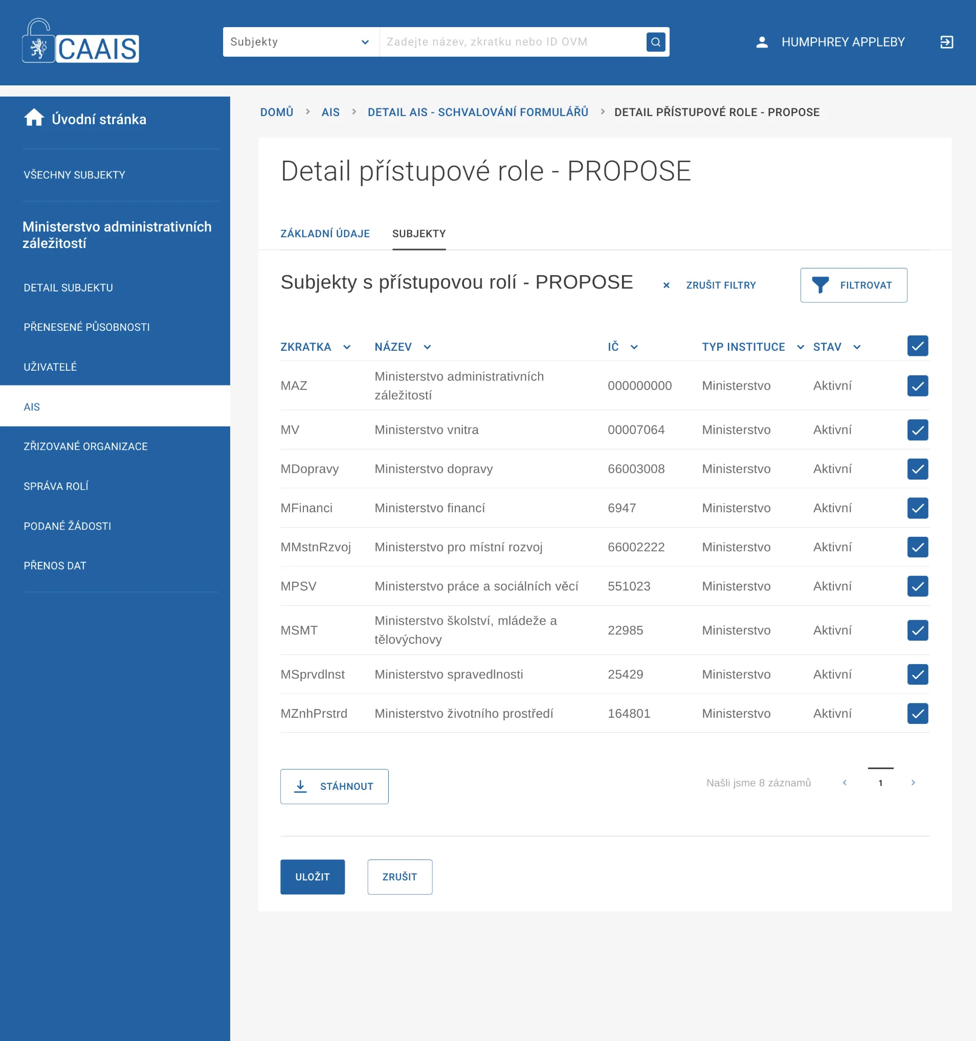 Dalším krokem je přiřazení subjektů, které mohou tyto role svým uživatelům přidělovat. Děje se tak z detailu role. S výhodou můžeme v tomto kroku použít filtraci. Roli navrhovatele umožníme přiřazovat všem ministerstvům, zatímco roli schvalovatele ponecháme na Ministerstvu pro administrativní záležitosti.