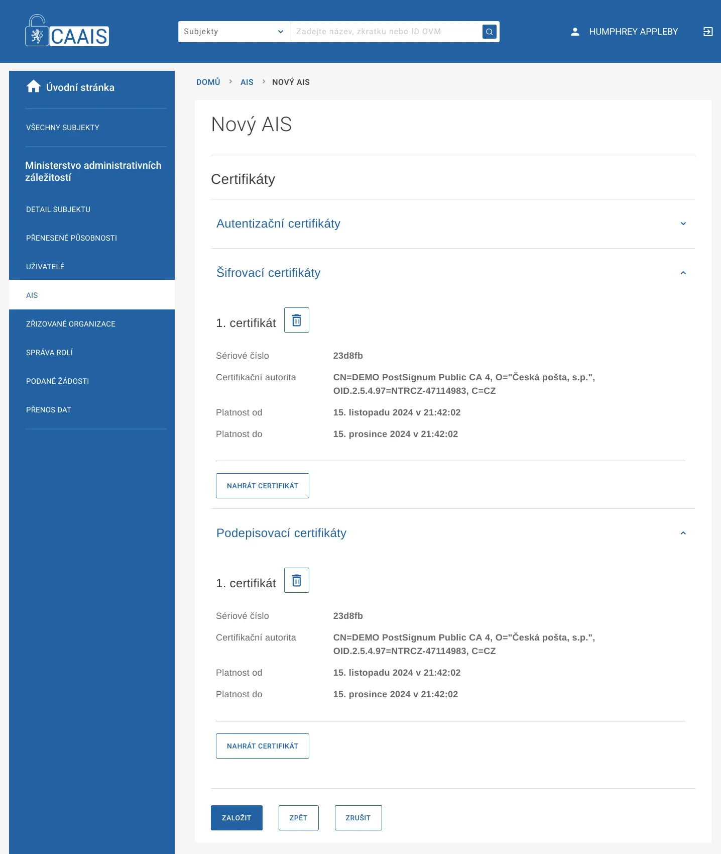 V dalším kroku do systému nahrajeme veřejnou část podpisového certifikátu a certifikátu pro šifrování, jak jsme je obdrželi od (testovací) certifikační autority. Může se jednat o stejný certifikát, pokud je určen k podpisu i k šifrování. Registrovaný lze mít ovšem pouze jeden certifikát pro podpis (administrativní omezení) a pouze jeden certifikát pro šifrování. CAAIS nepřijme SAML 2.0 požadavek, pokud není podepsán (jediným) registrovaným podpisovým certifikátem; odpověď pak vždy šifruje k tomu (jediným) registrovaným certifikátem.