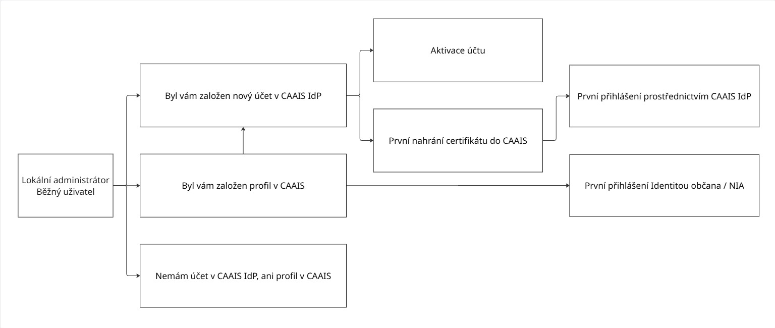 Jakmile vám statutární zástupce založí účet, budete o tom informováni prostřednictvím e-mailové zprávy s předmnětem „Byl vám založen profil v CAAIS“ (a je potřeba se doztotožnit), případně s předmětem „Byl vám založen nový účet v CAAIS IdP“ (pro již ztotožněné uživatele). Tento email obsahuje postup, podle kterého je potřeba provést první přihlášení a aktivaci vašeho uživatelského účtu.