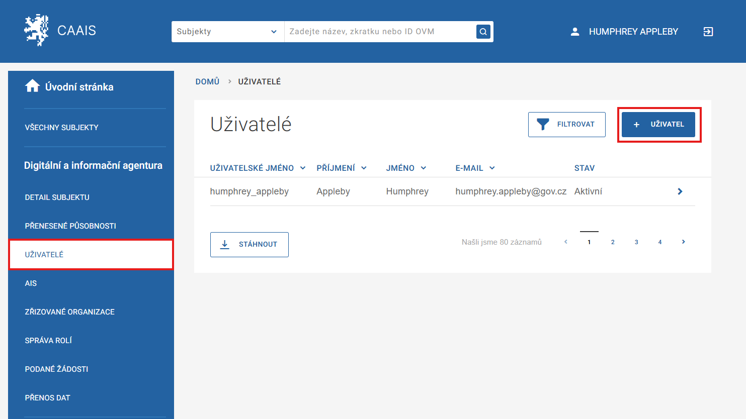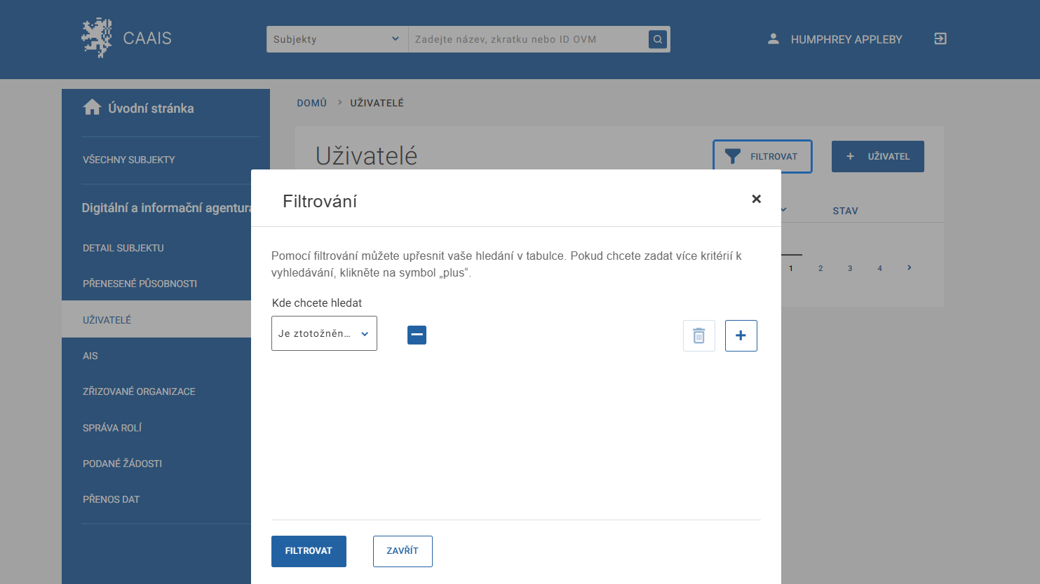 Pokud běžný uživatel, kterému má být přidělena role lokálním administrátorem už účet v CAAIS má. V tomto případě v záložce Uživatelé zvolím možnost filtrovat a uživatele najdu.