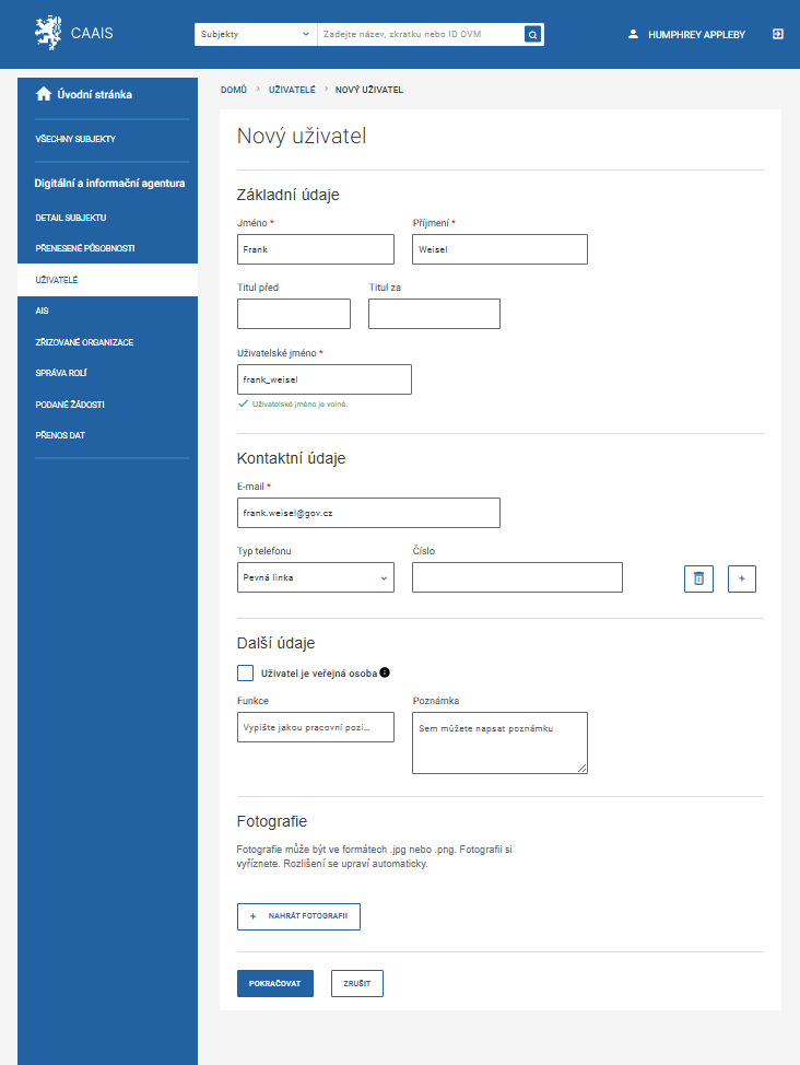 Povinná políčka jsou označena hvězdičkou. Uživatelské jméno se vygeneruje automaticky na základě jména a příjmení, zvolit ovšem můžete i vlastní.