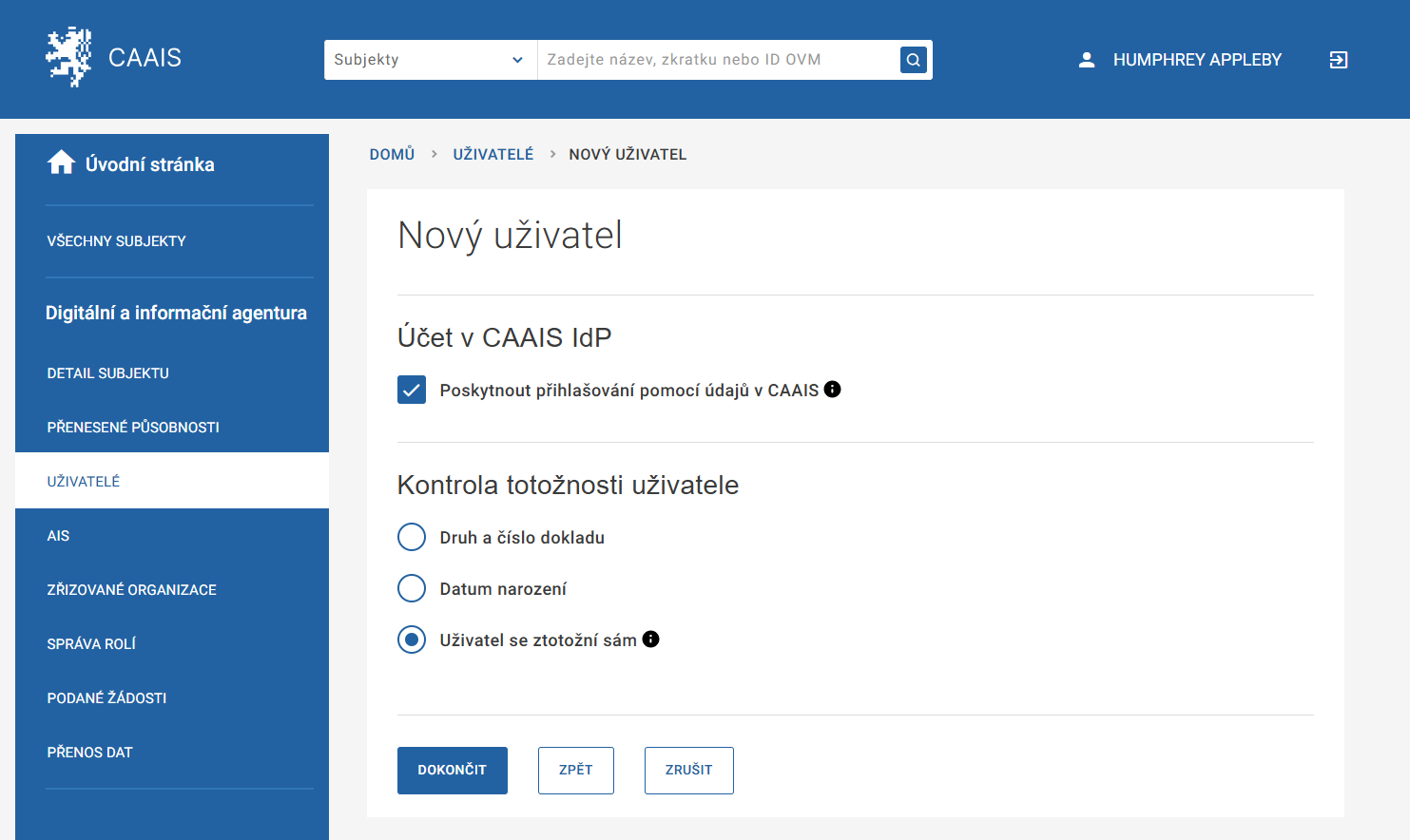 Na stránce naleznete defaultně vybranou volbu „Poskytnout přihlašování pomocí údajů v CAAIS“. Znamená to, že systém zajistí odeslání notifikace uživateli s výzvou k aktivaci účtu, případně k tzv. doztotožnění. Pokud tuto možnost nezvolíte, uživatel se nebude moci přihlašovat pomocí přihlašovacích údajů vydaných v CAAIS IdP, nicméně účet mu vznikne a bude se moci přihlašovat pomocí jiných prostředků, jmenovitě pomocí NIA.