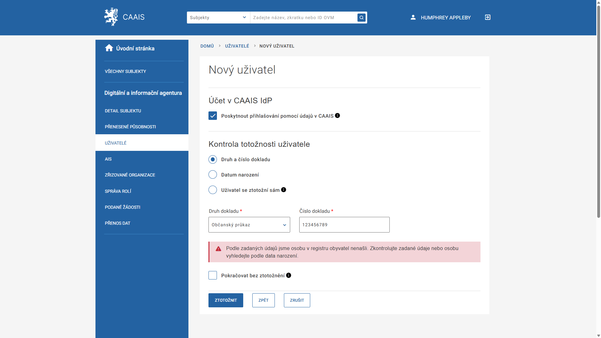 Postupujte stejným způsobem jako při zakládání uživatele. I v případě, kdy víte, že ztotožnění na základě čísla dokladu není možné, vyplňte do pole libovolné číslo. Objeví se červená hláška „Podle zadaných údajů jsme osobu v registru obyvatel nenašli“. Zároveň se zobrazí i nová možnost „Pokračovat bez ztotožnění“.