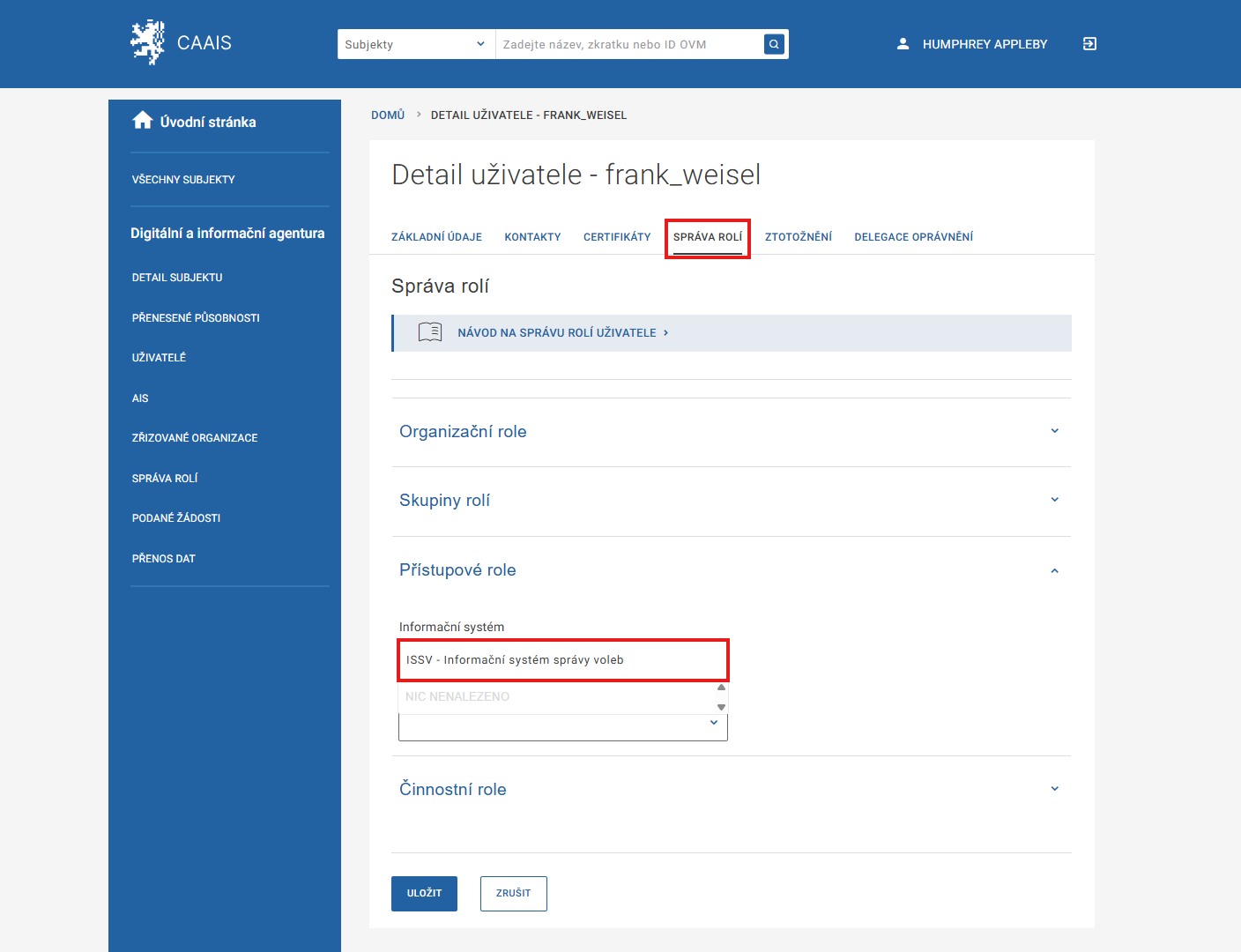 Po přihlášení do CAAIS musí lokální administrátor přiřadit běžným uživatelům přístupové role ke konkrétním informačním systémům. V záložce Správa rolí v detailu uživatele kontrolujete, případně přidáváte a odebíráte konkrétnímu uživateli příslušné role. Jedná se o organizační, skupinové, přístupové a činnostní role. Seznam rolí, které má uživatel k dispozici, zobrazíte po rozkliknutí příslušného názvu role.