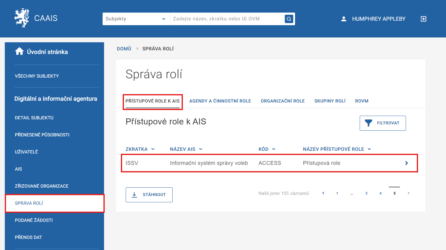 Po rozkliknutí řádku Přístupové role uvidíte v úvodní záložce seznam veškerých přístupových rolí, které byly vašemu subjektu uděleny garanty jednotlivých Agendových informačních systémů.