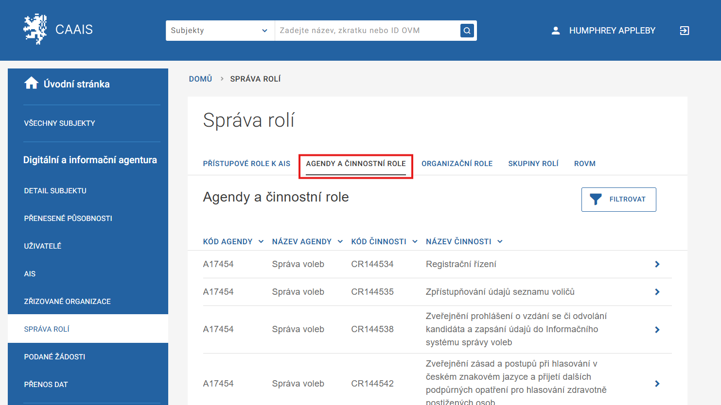 Položky v záložce Agendy a činnostní role jsou synchronizovány s oprávněními vašeho subjektu dle RPP.