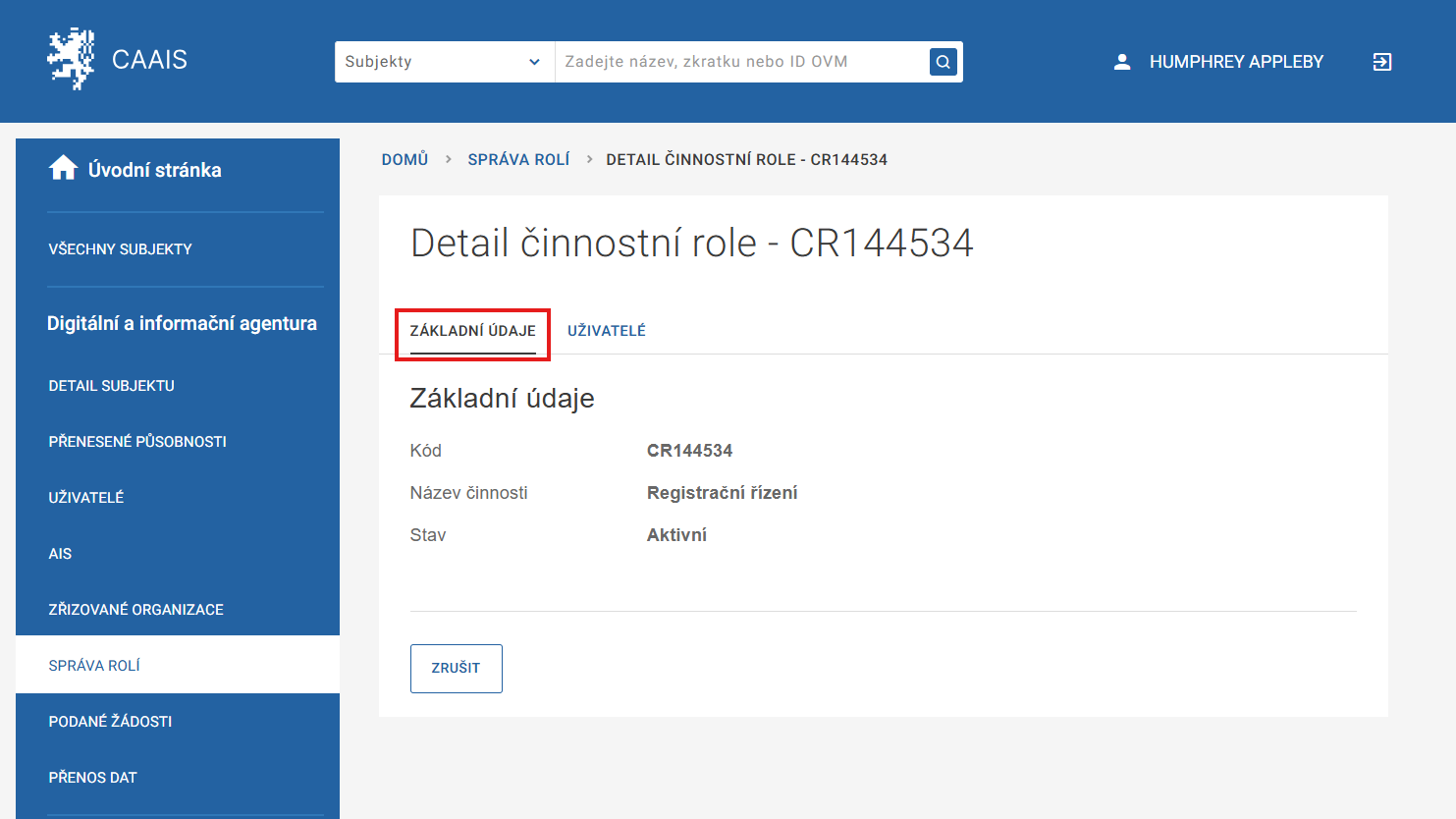 Kliknutím na řádek konkrétní role se dostanete na její detail se základními údaji.