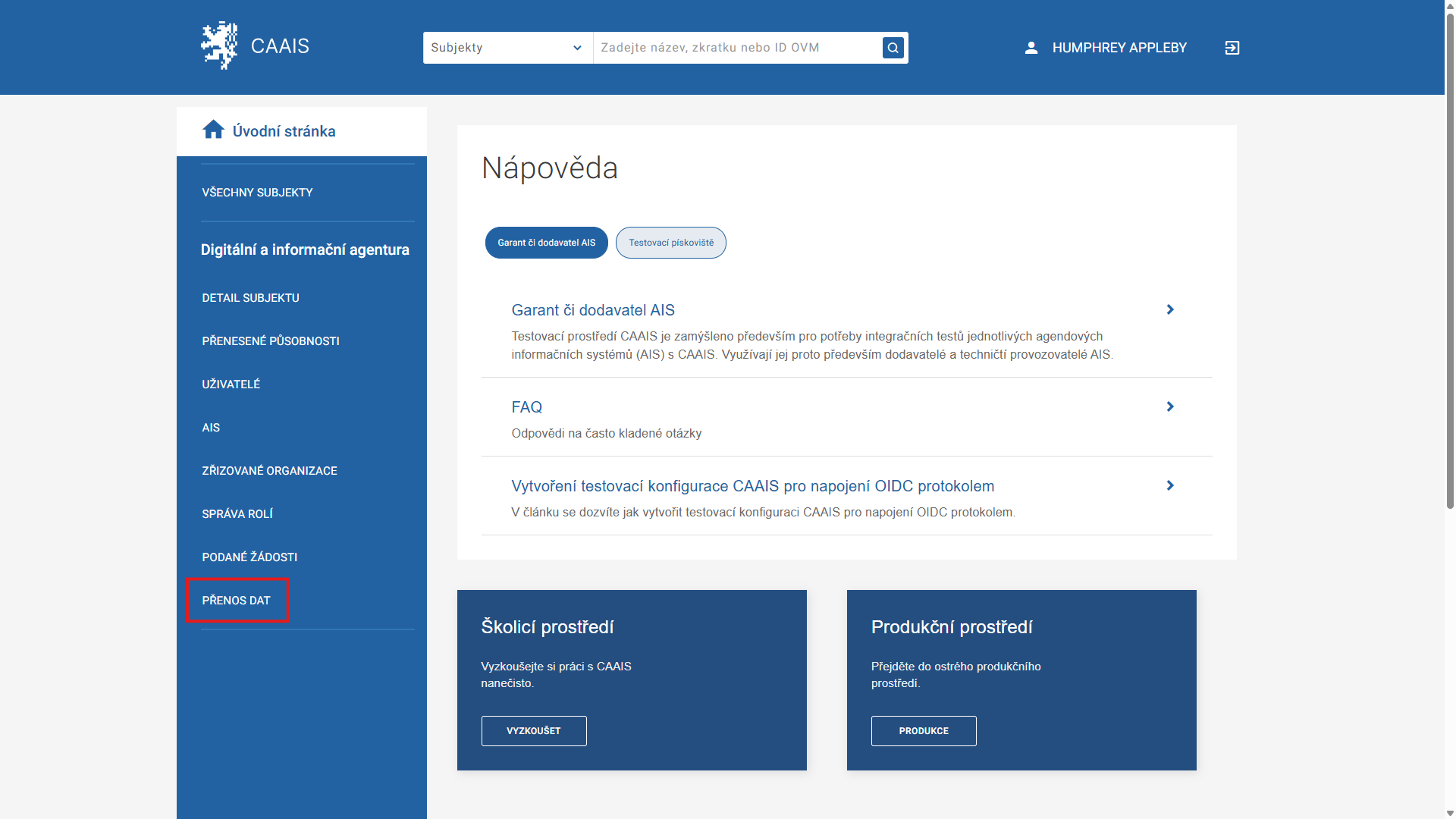 Přenos dat mezi systémy JIP / KAAS a CAAIS provádí lokální administrátor (LA) vašeho subjektu. Tento proces zahrnuje přenesení uživatelských účtů a jejich rolí z původního systému do CAAIS.