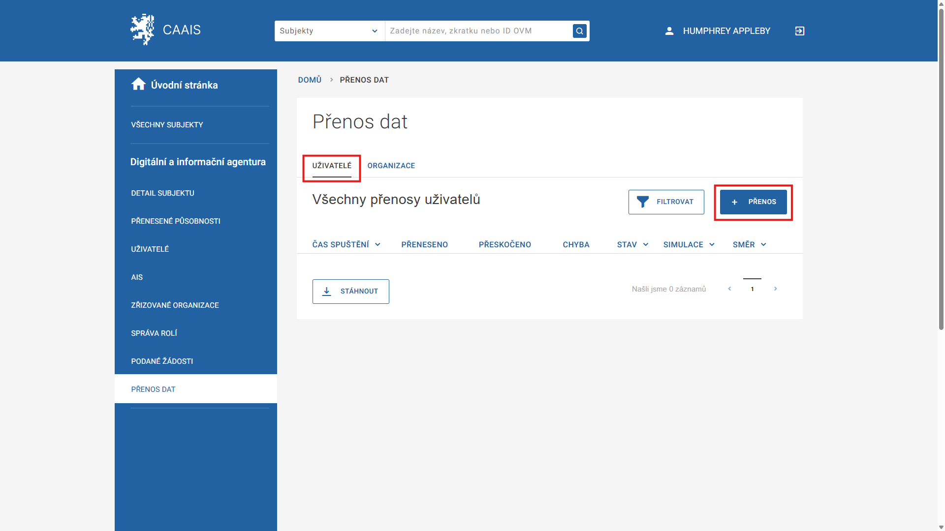 Systém vás přesměruje do prostředí pro migraci dat z JIP/KAAS, na záložku Uživatelé. Jakmile nějaké přenosy provedete, najdete zde jejich seznam. Pro zahájení nového klikněte na + PŘENOS.