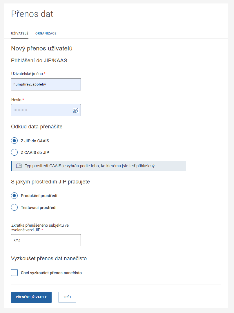 Na další stránce „Nový přenos uživatelů“ vyplňte své přihlašovací údaje (jméno a heslo) do JIP/KAAS a zvolte, zda chcete přenášet data z produkční nebo testovací verze JIP/KAAS. Pole „Zkratka přenášeného subjektu ve zvolené verzi JIP“ už bude přednastavená, není potřeba ji měnit. Nakonec určete, zda chcete provést simulaci přenosu („Chci vyzkoušet přenos nanečisto“), nebo jste připraveni na ostrý režim. Pokračujte tlačítkem PŘENÉST UŽIVATELE.