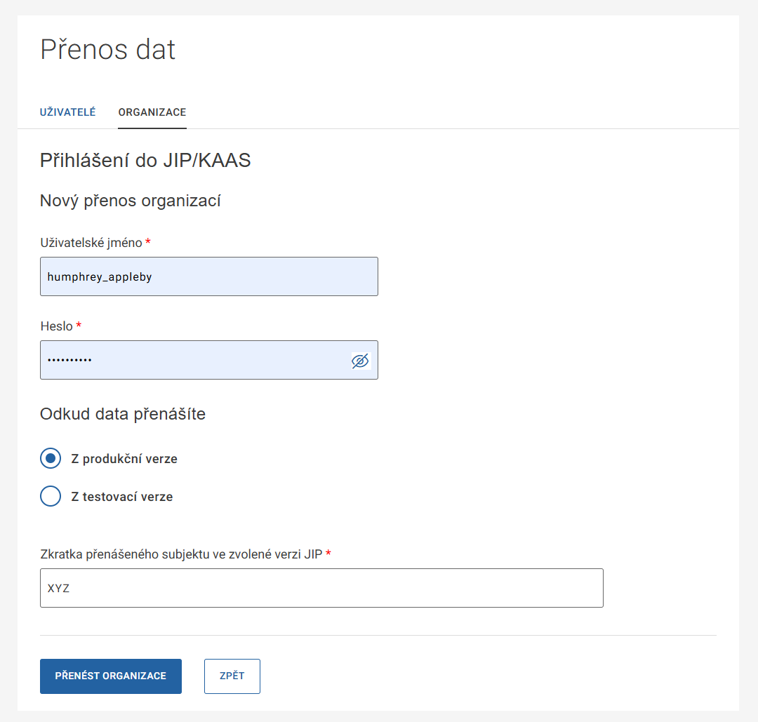 Na další stránce „Nový přenos organizací“ vyplňte své přihlašovací údaje (jméno a heslo) do JIP/KAAS a zvolte, zda chcete přenášet data z produkční, nebo testovací verze JIP/KAAS. Pole „Zkratka přenášeného subjektu ve zvolené verzi JIP“ už bude přednastavená, není potřeba ji měnit. Pokračujte tlačítkem PŘENÉST ORGANIZACE.