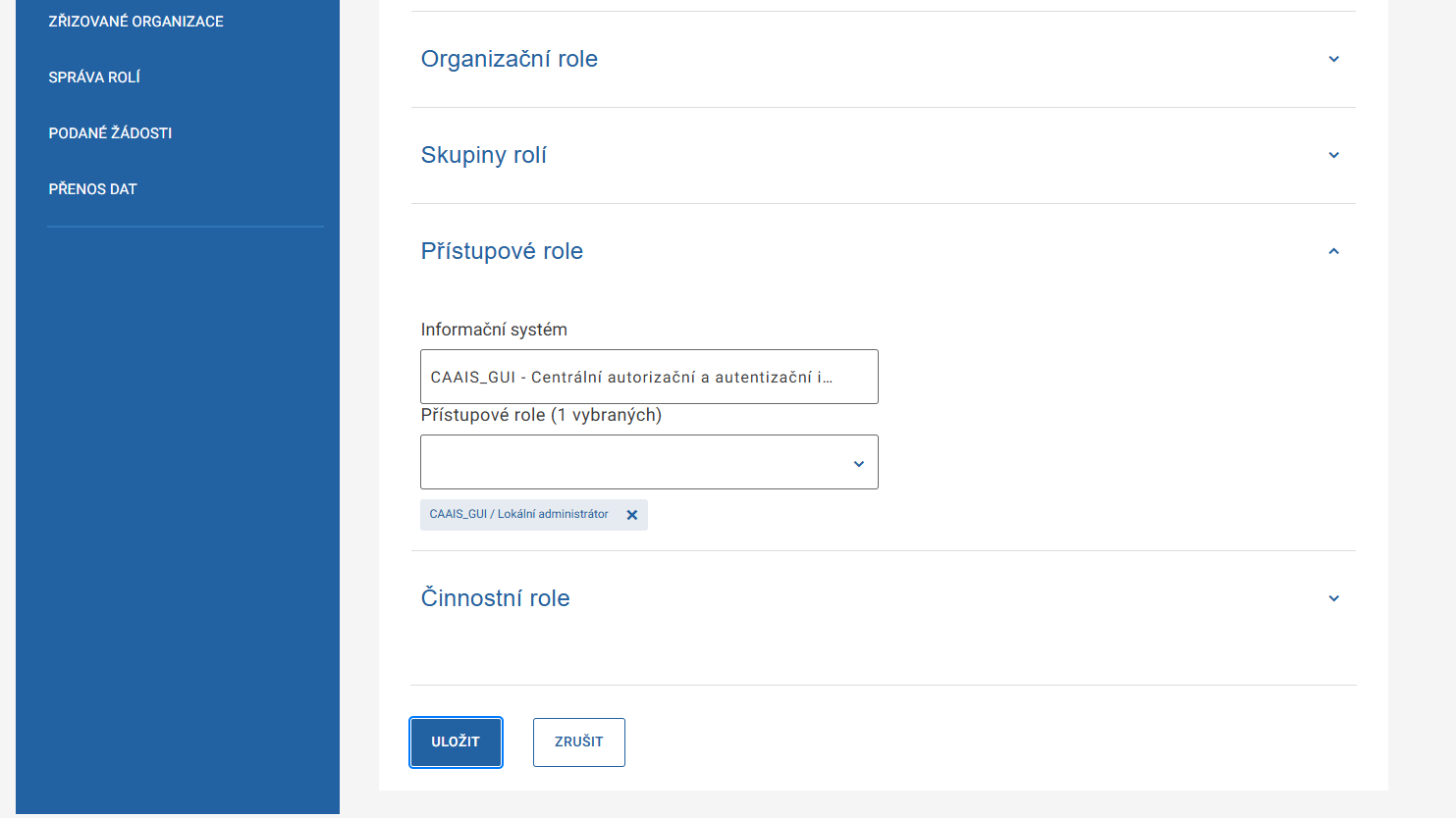 Pokud roli odebíráte, smažte ji kliknutím na symbol křížku a volbu uložte. Systém vás bude o změně informovat prostřednictvím datové zprávy, uživateli pak přijde notifikační e-mail.