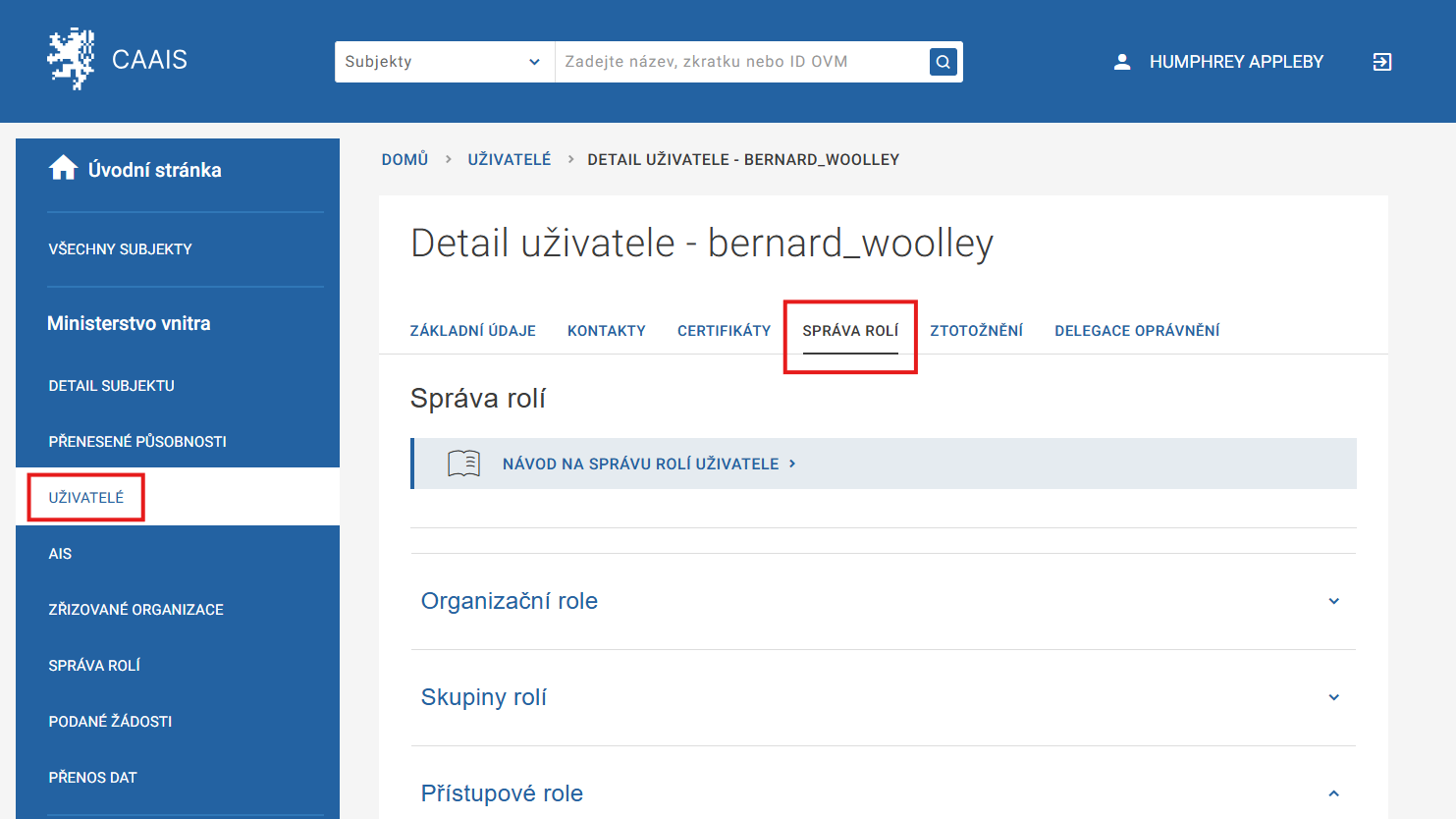 Zvolte záložku Správa rolí a rozklikněte možnost Přístupové role.