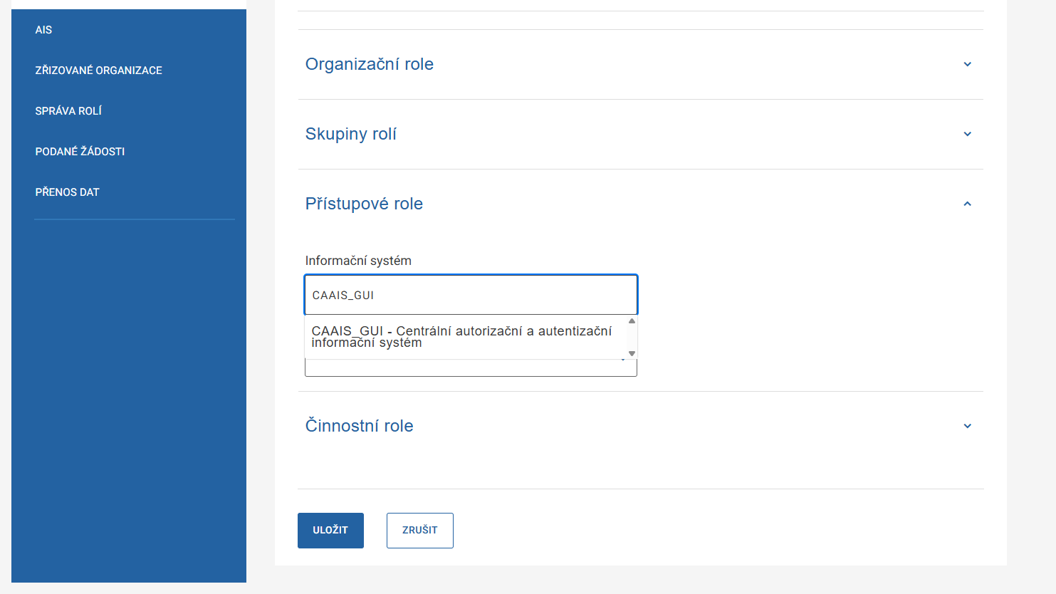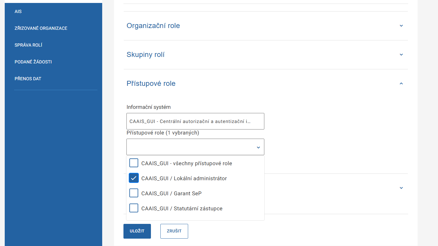 Objeví se nabídka přístupových rolí. Zaškrtněte volbu „CAAIS_GUI / Lokální administrátor“ a klikněte na ULOŽIT.