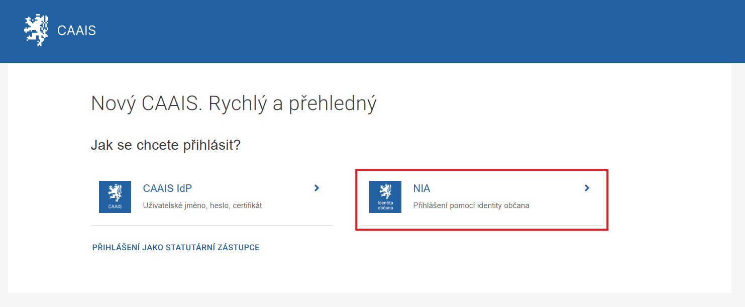 Jestliže si vyberete ověření totožnosti prostřednictvím Identity občana (NIA), CAAIS vás rozpozná na základě informací poskytnutých NIA a předá agendovému informačnímu systému informaci o vaší úspěšné autentizaci včetně sady vašich oprávnění (přístupových a činnostních rolí).